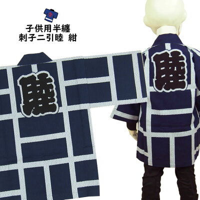子供用 半纏 刺子ニ引 紺 4号(10〜11才用) 大紋(背中)の文字:睦 エリの文字:睦 [ 半天 半纏 袢纏 法被 半被 祭り はっぴ ハッピ 祭り 衣装 お祭り用品 お祭り 衣装 にびき ニビキ ]