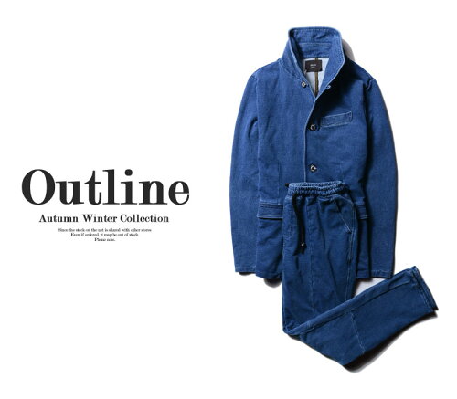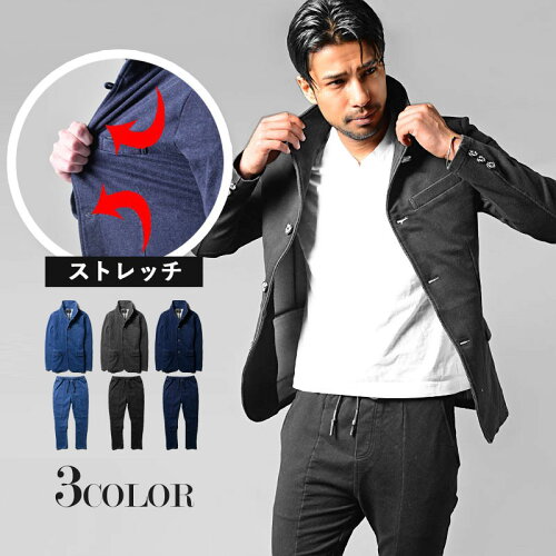 心地よい肌触りと快適な着心地を演出するスウェットデニム素材を用いたイタリアンカラージャケットとテーパードスキニーパンツのセットアップ。