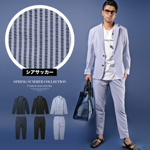 ◆サイズ◆ M:着丈66 身幅52 肩幅43 袖丈61 ウエスト78-82 股上26 股下70 ワタリ29 裾幅15 L:着丈68 身幅54 肩幅45 袖丈63 ウエスト82-86 股上27 股下70.5 ワタリ31 裾幅16 (モデル 185cm・72kg L着用) ◆カラー◆ ブラック・ネイビー・ストライプ ◆素材◆ ポリエステル100%◆商品詳細◆ 毎年当店大人気!春夏にピッタリのシアサッカーセットアップスーツ!薄手で清涼感有るサラッとしたシャツの様な着心地が特徴。