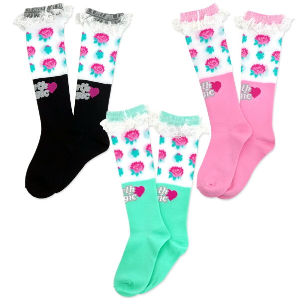 2021年 EARTH MAGIC(アースマジック)春夏新作 ♥スウィートローズマフィー レース付ハイソックス♥ 今季新作!!スウィートローズマフィーシリーズのレース付ハイソックスです♥ ラメ入りでシアー感のある生地にはシリーズ同柄のローズ模様、 切り替え部分のフロントにはアースマジックのロゴが入っています★